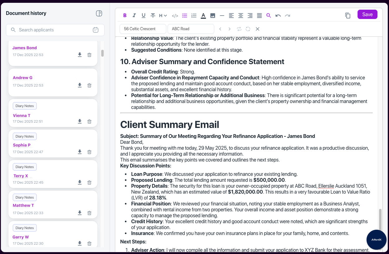 AffordX takes the hassle out of paperwork by automating income and expense analysis, saving you time and reducing errors. Our smart tools also generate clear, structured diary notes from client interactions so you can stay focused on advice, not admin.