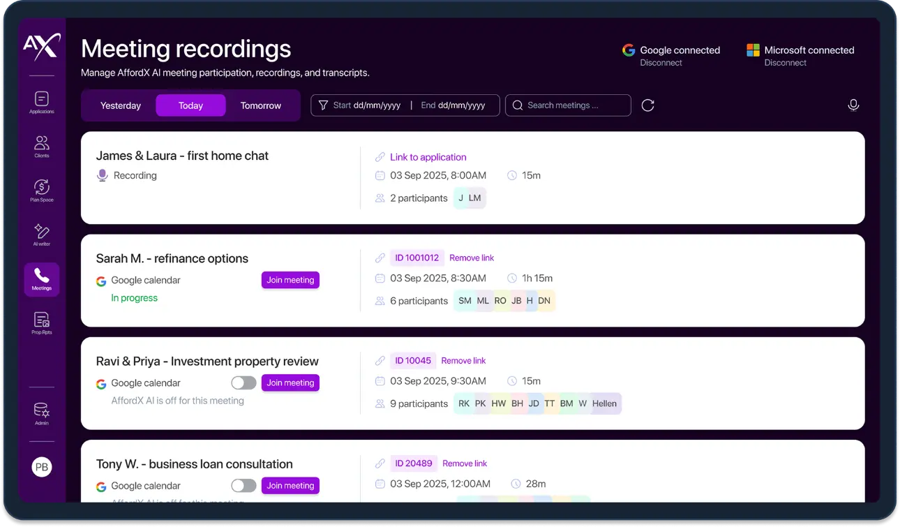 AffordX records client conversations, transcribes them accurately, and produces structured meeting notes in your preferred template, ready to be attached to the client’s application.